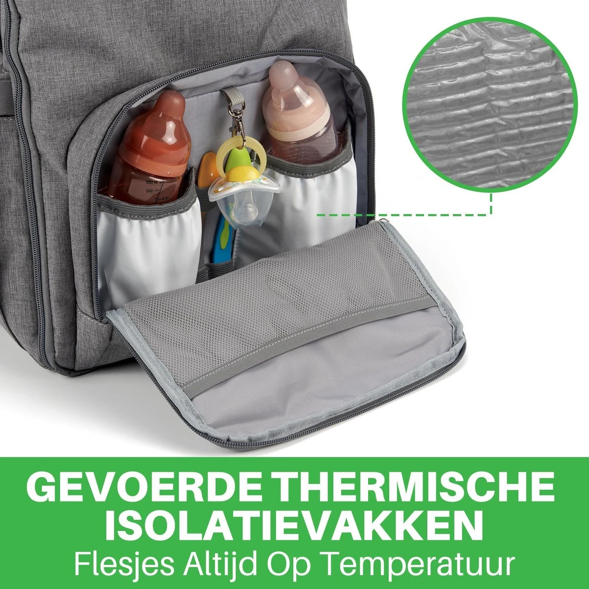 Dankzij een dubbel thermisch gevoerde laag blijft de inhoud van een flesje of pakje langer op temperatuur.