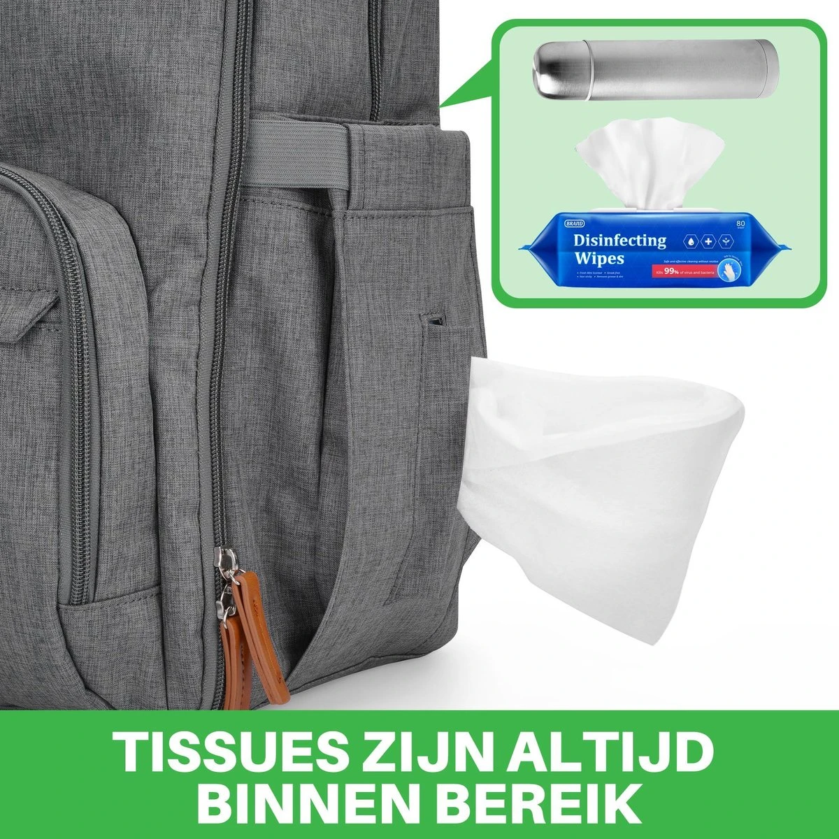 De tas koop je inclusief een gratis verschoonmatje voorzien van foam, ideaal als je onderweg bent en je kindje een schone luier nodig heeft. Zo is je baby tijdens het verschonen altijd verzekerd van een comfortabele ondergrond.