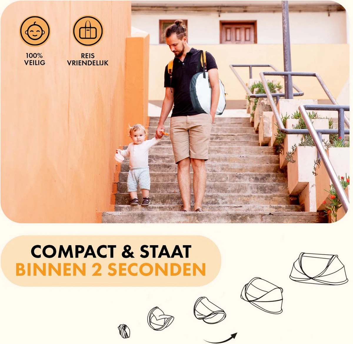 De DERYAN Peuter Luxe is dé ideale oplossing én vervanging van het zware campingbedje. Laat je niets meer in de weg staan met deze compacte, lichtgewicht & pop-up reistent. De DERYAN Peuter Luxe biedt een ultieme bescherming tegen zon, muggen en andere insecten. Met zijn 2,4 kg neem je ‘m in een handomdraai mee naar ouders, familie, vrienden, vakantie of de wereldreis van je dromen! Ondenkbaar veel mogelijkheden!