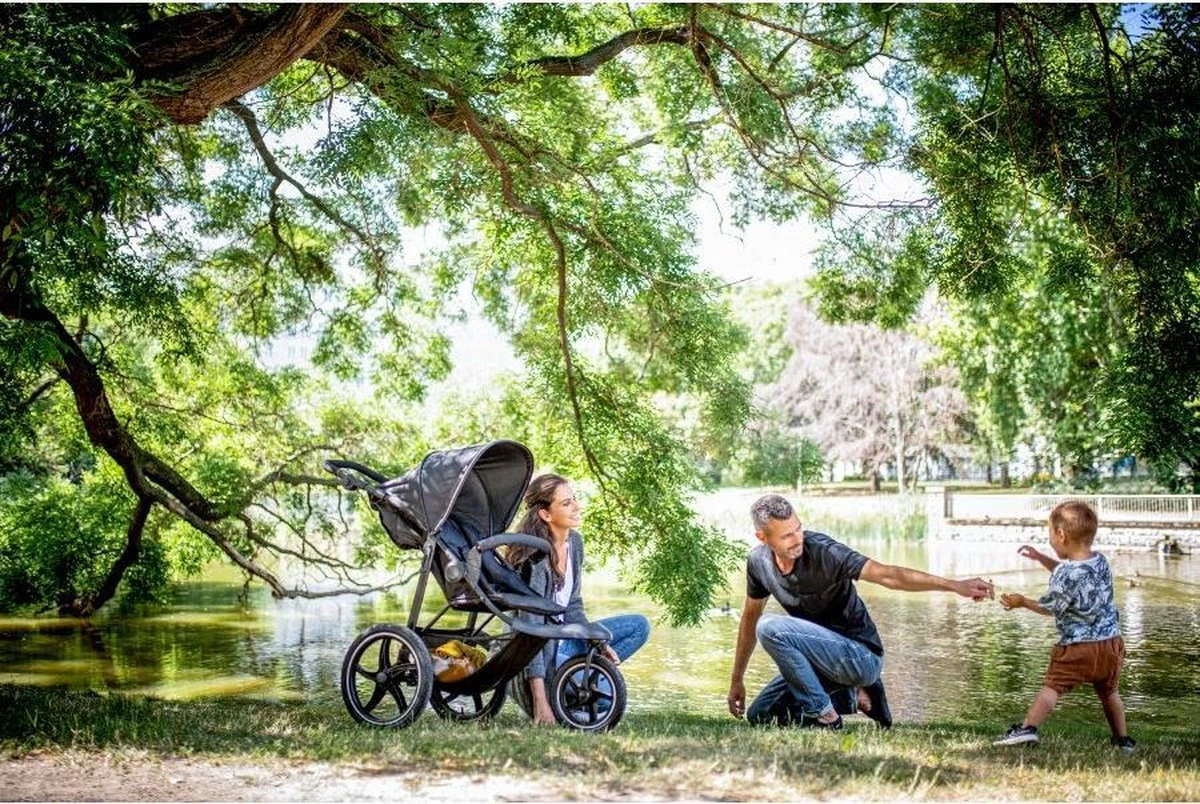 Zodat uw kind zich vanaf het prille begin tot aan de kleutertijd comfortabel voelt, biedt de extreem veerkrachtige kinderwagen een XL-ligvlak en een grote kap met UV-bescherming 50+, die beschermt tegen zon en regen. Op warme dagen kun je hem ook openen, waardoor een mesh-stof tevoorschijn komt die luchtdoorlatend is en dient als een groot kijkvenster. Reflecterende lichtstrips op de motorkap brengen jou en je gezin veilig thuis aan het einde van je avontuur. Je verpakt het eten voor je tocht gewoon in de enorme mand.