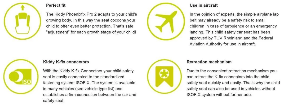 De lichtgewicht Phoenixfix Pro2 autostoel van Kiddy blinkt uit met uitstekende scores in de autostoelcategorieën veiligheid, ergonomie en materiaalgebruik voor kinderen van 9 maanden tot 4 jaar of met een gewicht van 9-18 kg (Groep 1). Dankzij de verbeterde samenstelling van de kracht-absorberende materialen in de zij- en voorbescherming biedt dit autostoeltje perfecte bescherming in het geval van een frontale of zijwaartse botsing. De hoofdsteun en zithoogte kunnen met één hand versteld worden waardoor het stoeltje in de hoogte met je kind kan meegroeien. Zo heeft je kleintje de beste en veiligste zitpositie terwijl hij/zij zichtbaar blijft. Dankzij het eenvoudig te installeren Isofix systeem met de Kiddy K-fix aansluitingen weet je zeker dat het stoeltje altijd veilig in de auto is bevestigd. Het kind wordt beschermd met de ingebouwde 3-punts gordel en het veiligheidskussen.