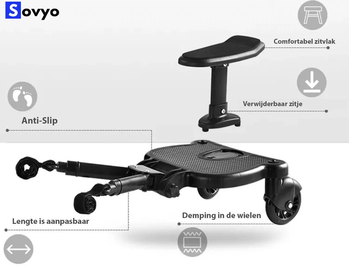 Dit universele meerijdplankje is geschikt voor bijna iedere kinderwagen of buggy door de handige bevestiging met klittenband.