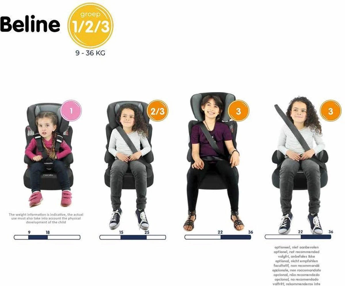 Het autostoeltje Nania BeLine is een meegroei autostoel groep 1/2/3. Het autostoeltje is geschikt voor kinderen met een gewicht vanaf 9 tot 36 kg. De leeftijdsindicatie is ongeveer vanaf 1 tot 12 jaar.