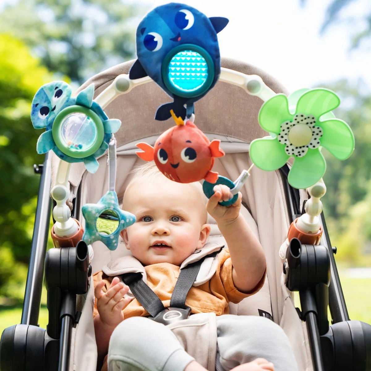 Tiny Love’s Treasure the Ocean-kinderwagenboog voor muziek tijdens de wandeling biedt baby’s 8 speelse activiteiten die binnenshuis en onderweg voor plezier en amusement zorgen. De verschillende speeltjes op de activiteitenboog stimuleren het gehoor, het gezicht en de tastzin van je kleintje en via de interactieve functies leren baby’s de basisprincipes van oorzaak en gevolg, waardoor de cognitieve ontwikkeling wordt ondersteund. Onderweg een vergelijkbaar speeltje hebben stelt baby’s ook gerust en biedt een vertrouwd gevoel dat alles in orde is in een onbekende, nieuwe omgeving. De universele bevestigingsclips maken de kinderwagenboog een ideaal kinderwagenspeeltje voor je kleintje. De Tiny Love Treasure the Ocean muziek tijdens de wandeling bevordert de ontwikkeling van je baby en stimuleert de volgende ontwikkelingen: motoriek, zintuigen en cognitieve vaardigheden. Muziek tijdens de wandeling maakt deel uit van de Treasure the Ocean-collectie en leert kleintjes om van de oceaan te houden en deze te beschermen.