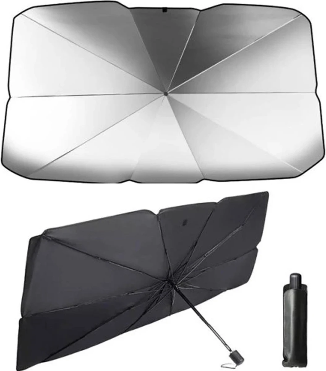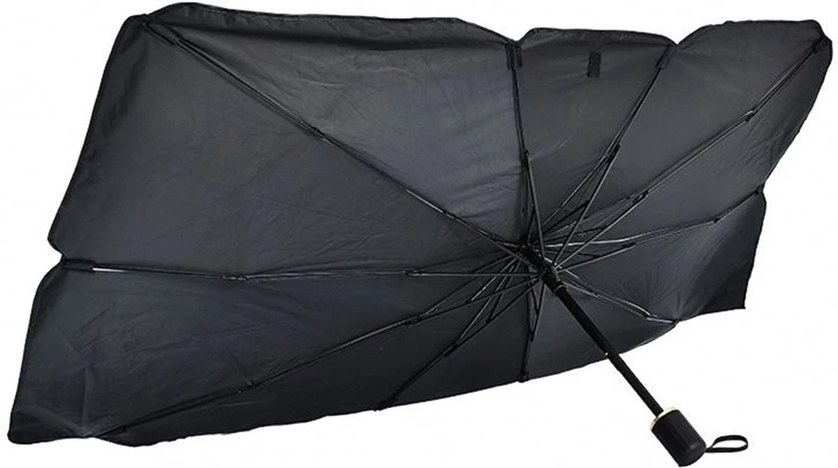 Paraplu zonnescherm voor de auto voorruit, 130 cm breed. Het beschermt het interieur van de auto tegen overmatige zonnestraling en vermindert de opwarming van de auto aanzienlijk. Extreem eenvoudige montage op de voorruit dankzij het snel in- en uitklappen als een gewone paraplu. Het is volledig universeel – past op elke voorruit in alle voertuigen.